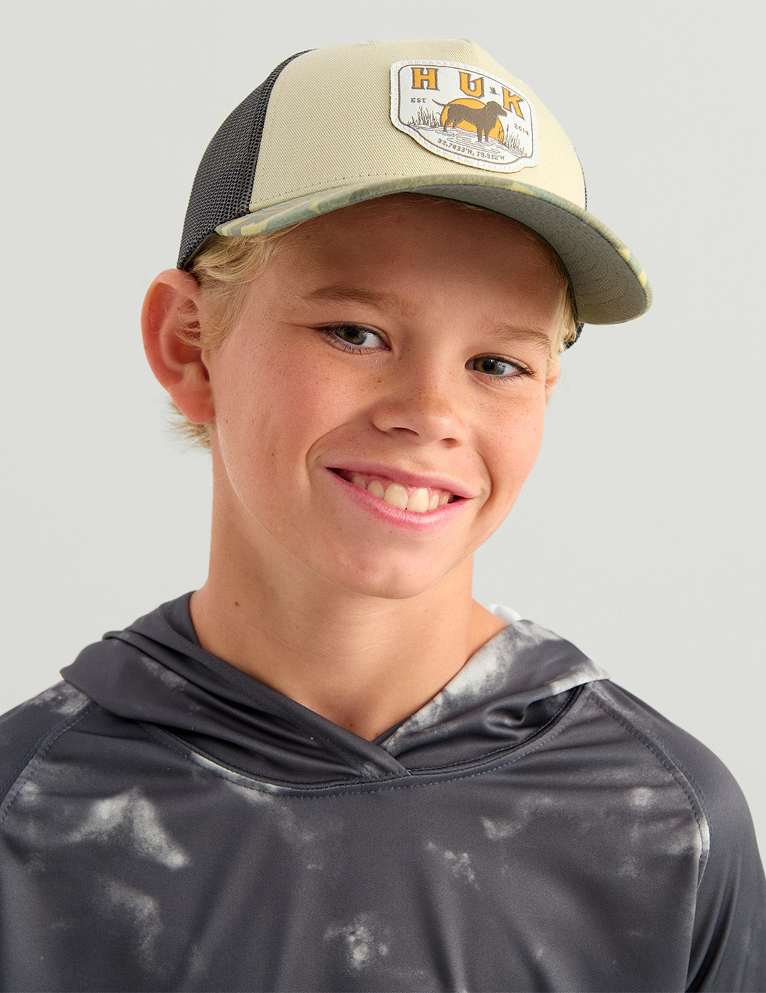 Built for young anglers and dog-loving adventurers, this mid-profile kids trucker features a woven lab patch and a camo bill that brings just the right amount of outdoor grit. Breathable mesh back panels keep things cool, while a comfortable moisture-wicking sweatband helps them stay focused from dock to backyard. Finished with classic trucker style and Huk durability, it’s an everyday hat made for big adventures.