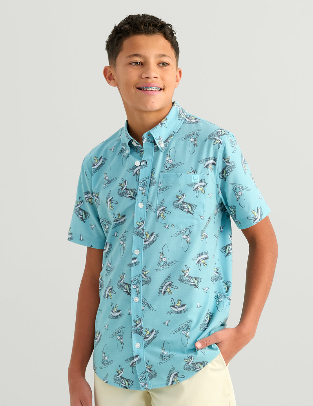 The Kona Short Sleeve Shirt for kids is a versatile, comfortable button-down, perfect for all-day adventures. Made with lightweight, quick-drying fabric, the Kona features two-way stretch and UPF 30+ sun protection to keep little ones safe under the sun. It also includes a handy sunglasses wipe, making it both functional and fun for a day on the water or playing outdoors. The Kona transitions effortlessly from a day of exploring to casual moments with friends and family.